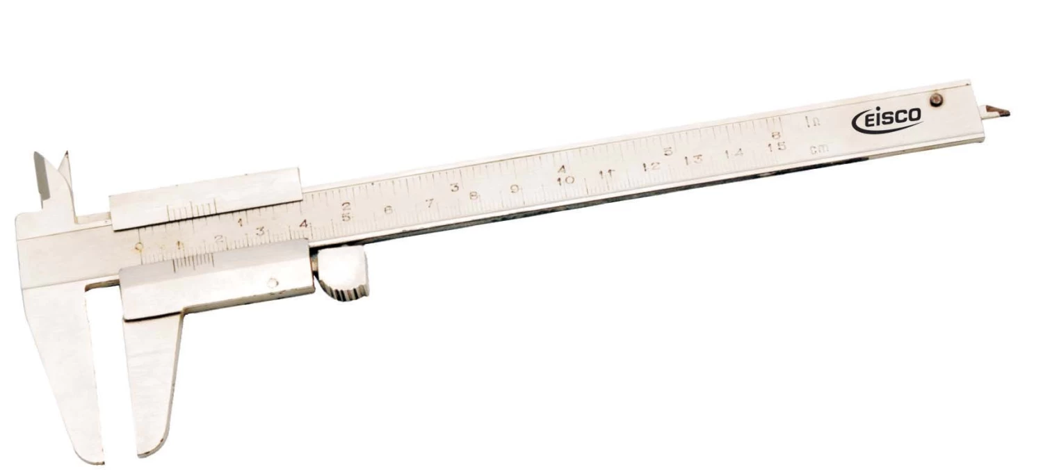 IME type, Improved design, plated steel with dual scale 0-15 cm x 0.1 mm and 6 x 1/128”, provided with thumb movement for easy motion of jaws, in box.