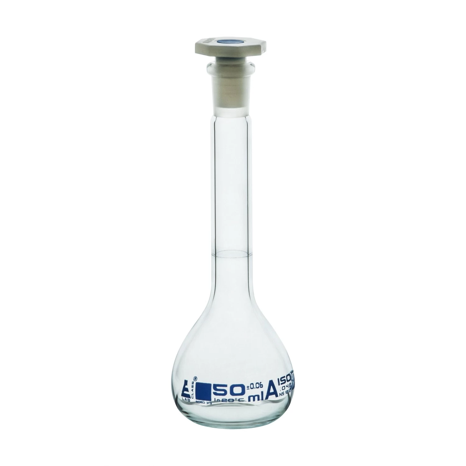 50ml capacity volumetric flask made of high quality, heavy duty borosilicate 3.3 glass. Class A tolerance, ±0.06ml. Single, white graduation mark. Blue printed specifications. Fitted with a chemically resistant, interchangeable 12/21 polypropylene stopper.