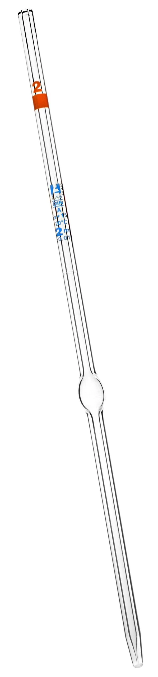 Eisco Labs 2mL Volumetric Pipette, Borosilicate glass, Class A with +/-0.010 tolerance as per DIN ISO 648 standard. Calibrated for delivery. With blue graduation/markings and orange color code for easy volume identification. Individually wrapped. Length: 12″.