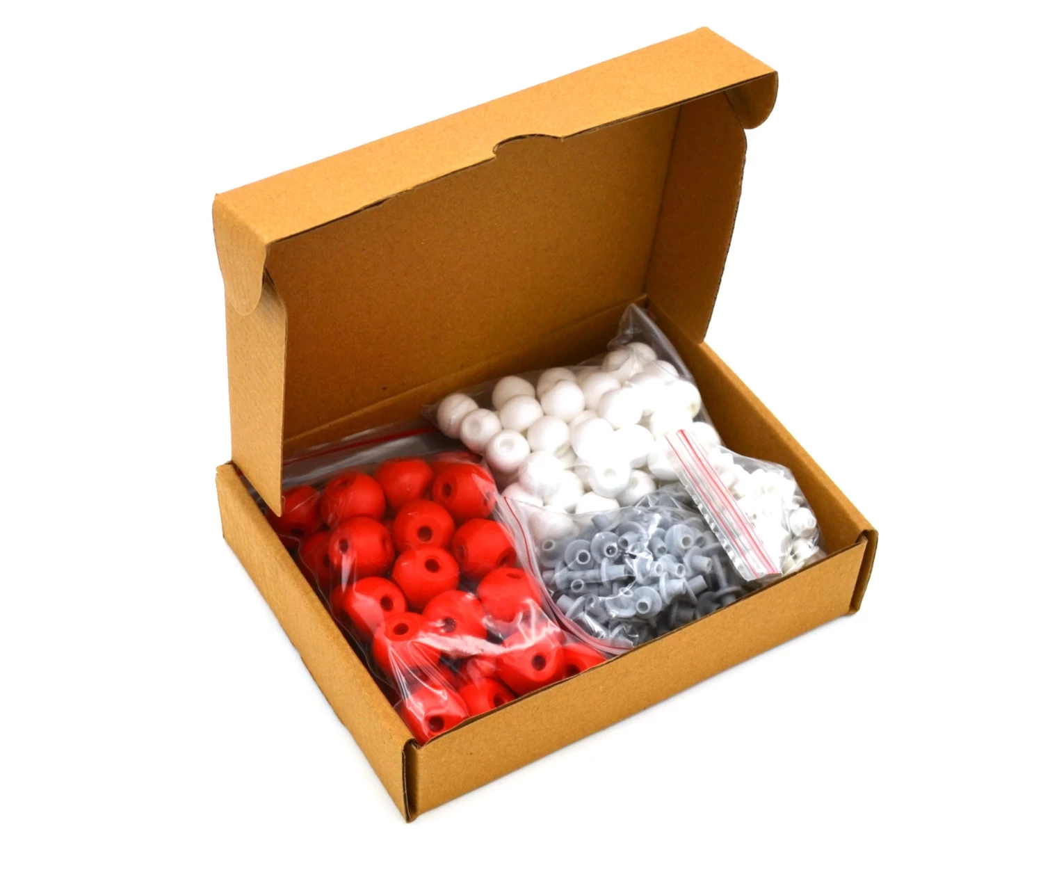 - INCLUDED || 62 White Hydrogen balls, 31 Red Oxygen balls, 44 Gray links, 62 White links