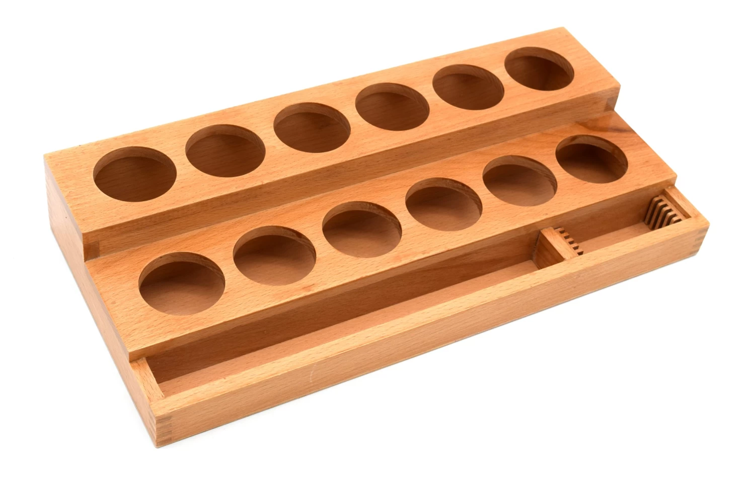 Polished Hardwood staining bottle stand. Each stand holds 12 dropping bottles, up to 60ml each. Stand offers addition placing for up to 5 staining slides. The stand is approximately 12.75″ wide, 6″ long and stands 2.25″ tall.